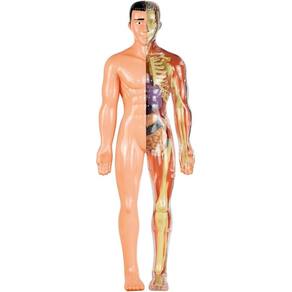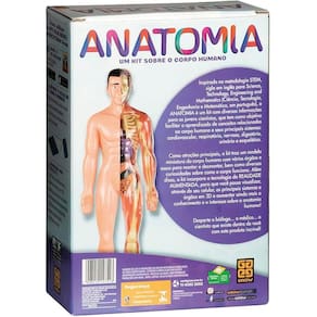 O kit inclui um modelo do corpo humano para montar, com ossos e orgaos, além de um panfleto para auxiliar na montagem e manual ilustrado com informacoes e curiosidades.