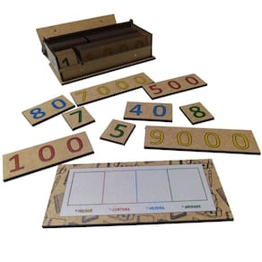 Garantia 3 meses / Peso: 0,418kg / Cor predominante: madeira / Ref: 110APRENDMAT Dimensões da caixa organizadora: 16cm (C) x 7cm (L) x 4,5cm (A); Dimensões da peça maior: 15cm (C) x 6cm (L) x 1mm (A); Dimensões da peça menor: 3,5cm (C) x 3cm (L) x 1mm (A); Idade recomendada: 4 anos; Cuidados: não utilizar materiais abrasivos na limpeza, não molhar. Conteúdo: 1 caixa organizadora, 1 tabuleiro, 9 milhares, 9 centenas, 9 dezenas, 9 unidades. Material: madeira MDF, adesivo.