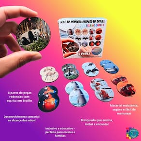 - 8 pares de peças redondas com imagens reais de animais e relevo em Braille feito com strass para fácil leitura tátil