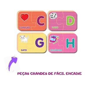 Ao pegar uma letra, será preciso identificar a outra peça que completa o quebra-cabeça, uma com a imagem da letra e outra com a imagem e nome do objeto ou animal que começa com aquela letra.