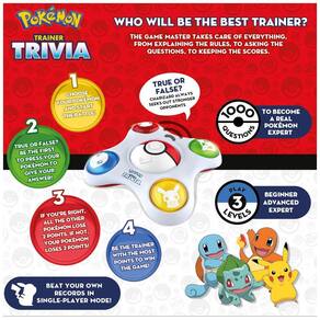O jogo eletrônico Pokémon Trainer Trivia é um jogo de perguntas e respostas em que um mestre virtual conduz as rodadas, apresenta informações sobre o universo Pokémon e desafia os jogadores a decidir se as afirmações são verdadeiras ou falsas. Com um conjunto de 1000 perguntas, o jogo explora personagens, habilidades e elementos da franquia, incentivando a memorização de dados e o raciocínio rápido durante as partidas.