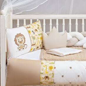 Jogo Enxoval de Berço Unisex 14 Peças Avelã Com MosquiteiroTotal 14 Peças1 Edredom 130cm x 75cm1 Cabeceira 0.60 X 0.401 Lateral 1.28 X 0.251 Trança 1.28 X 0.121 Fronha 0,28 x 0,381 Lençol de Cima com Bainha1 Bando do mosqueteiro 1.40 x 0.201 Mosqueteiro 4.50 x 1.501 Almofada 0.40 x 0.301 Trocador 0,60 x 0,451 SAIA BOX 1,30 x 0,70 x 0,301 lençol de cima 1,20m x 0,80 cm.1 Protetor impermeável para berço americano 1,30m X 0,80cm.1 Travesseiro 0,30cm x 0,40COMPOSIÇÃO:Tecido estampado: 100% algodão.Tecido colorido: 100% poliéster.Tecido lençol : 50% algodão 50% poliéster.Tule : 100% poliamida.Plástico: 100% PVC.Enchimento: 100% poliéster.Edredom dupla face todo matelado com várias costuras.Laterais e cabeceiras com zíper para facilitar a lavagem de seu produto.