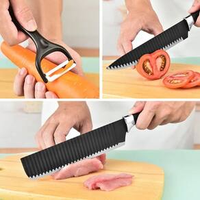 Características do Produto: Lâminas em aço inoxidável resistentes à oxidação. Revestimento superficial que facilita o deslize do corte. Cabo ergonômico em polímero de alta resistência térmica. Faca Chef 20cm indicada para cortes volumosos e carnes. Faca de Trinchar 20cm ideal para fatias finas e precisas. Cutelo 20cm estruturado para cortes de impacto e ossos pequenos. Faca de Descascar 9cm otimizada para frutas e vegetais. Tesoura multiuso com função de quebra-nozes integrada. Descascador com lâmina cerâmica/inox de alta agilidade. Textura antiderrapante no cabo para maior aderência manual.