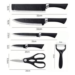 FICHA TÉCNICA E CONTEÚDO Material da Lâmina: Aço Inox Material do Cabo: Polipropileno Ergonômico Quantidade de Peças: 06 Preto (Texturizado) Comprimento Faca Chef: 20 cm (Lâmina) Comprimento Faca Trinchar: 20 cm (Lâmina) Comprimento Cutelo: 20 cm (Lâmina) Comprimento Faca Descascar: 9 cm (Lâmina) Tipo de Corte: Liso e Serrilhado (conforme peça) Acabamento: Antiaderente Funcional Peso do Kit: Aprox. 600g Uso: Profissional e Doméstico