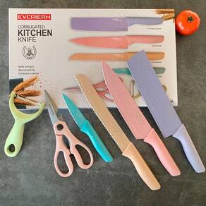 Conteúdo da Embalagem: - 1 Faca Chef 8 cm ; - 1 Faca Pão 8 cm ; - 1 Faca para descascar 3,5 cm ; - 1 Cutelo Pequeno 8 cm ; - 1 Descascador de cerâmica; - 1 Tesoura.