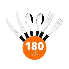 OBS: Veja na descrição os itens que acompanham o jogo. COMPONENTES DO KIT: 60 Faca para Churrasco Leme com Lâmina em Aço Inox e Cabo de Polipropileno Preto 4- Tramontina 23180404 60 Garfo de Mesa Leme com Lâmina em Aço Inox e Cabo de Polipropileno Preto - Tramontina 23182400 60 Colher de Sopa Leme com Lâmina em Aço Inox e Cabo de Polipropileno Preto - Tramontina 23183400 : 90 dias para vícios ou defeitos de fabricação; - Ideal para Restaurante, Lancheria, Padaria, Linha Doméstica, Residência, Gourmet; Faca para Churrasco Leme com Lâmina em Aço Inox e Cabo de Polipropileno Preto 4- Tramontina 23180404 - Pode ir à máquina de lavar louças facilitando seu dia a dia. - Peso Líquido: 0,016 kg. - Peso Bruto: 0,016 kg. - Dimensões Embalagem : 9cm A X 18cm L X 20cm P Garfo de Mesa Leme com Lâmina em Aço Inox e Cabo de Polipropileno Preto - Tramontina 23182400 - A lâmina de aço inox garante maior resistência devido a espessura do aço e a estampagem da lâmina. - Pode ir à máquina de lavar louças facilitando seu dia a dia. - Peso Líquido: 0,021 kg. - Peso Bruto: 0,025 kg. - Dimensões Produto: 13cm A x 23cm L x 18,5cm P. Colher de Sopa Leme com Lâmina em Aço Inox e Cabo de Polipropileno Preto - Tramontina 23183400 - A lâmina de aço inox garante maior resistência devido a espessura do aço e a estampagem da Lâmina. - Pode ir à máquina de lavar louças facilitando seu dia a dia. - Peso Líquido: 0,027 kg. - Peso Bruto: 0,029 kg. - Medidas Externas: 18,3cm x 3,9cm concha Marca: Não Informado
