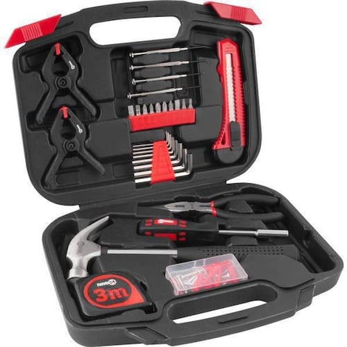 1 Jogo de ferramentas composto por: 1 maleta plástica com 89 peças sendo: 1 alicate de bico 6 em aço carbono 1 estilete de 18 mm 3 bits fenda em aço carbono (3 mm, 4 mm e 6 mm) 3 bits phillips em aço carbono (PH1, PH2 e PH3) 2 bits pozidrive em aço carbono (PZ0 e PZ1) 2 bits allen em aço carbono (H5 e H6) 1 cabo adaptador 1/4 em aço carbono (possui compartimento para guardar bits) 1 trena de 3 m 8 chaves allen em aço carbono (1,5 mm - 2,0 mm - 2,5 mm - 3,0 mm - 4,0 mm - 5,0 mm - 5,5 mm e 6,0 mm) 1 martelo 23 mm 4 chaves de precisão em aço carbono (fenda 2 mm e 2,5 / phillips PH0 e PH1) 2 grampos multiuso com mola de 86 mm 1 porta acessórios com 59 peças (5 alfinetes, 5 buchas de 6 mm, 5 parafusos phillips 4 mm x 19 mm, 39 pregos 7 x 20 e 5 ganchos)