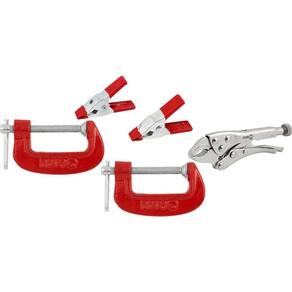 1 Jogo de ferramentas com 5 peças, sendo: 2 grampos tipo C de 2, 2 grampos multiuso e 1 alicate de pressão de 4