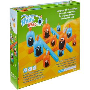 Um dos passatempos mais clássicos de todos os tempos ganhou uma nova roupagem em Nhac Nhac. Assim como no jogo da velha, o objetivo é completar uma fileira com três peças da mesma cor. A grande diferença aqui é que as peças, chamadas de Gobblers, tem 3 tamanhos diferentes, assim, você pode colocar uma sob outra do adversário, dando uma nova dinâmica às partidas. Simples de aprender e com partidas de curta duração, esse é o jogo ideal para que crianças comecem a desenvolver estratégias, além de também trabalhar a memória dos pequenos! Código de barras:7898572674063