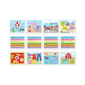 A dinâmica é simples: a criança observa as cenas das cartas por alguns minutos e responde às perguntas sorteadas no dado. São 6 perguntas diferentes para cada cena, incentivando o aprendizado, o raciocínio e a ampliação do vocabulário. Além disso, o jogo trabalha a fala ao incentivar a nomeação de figuras.
