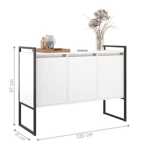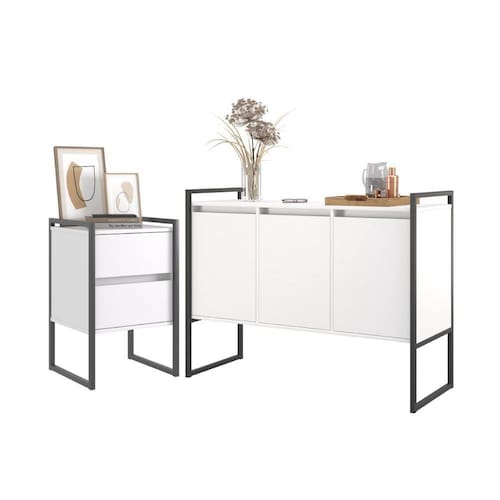 Com estrutura em aço 20x20, as peças apresentam durabilidade e estilo único. O buffet tem 3 portas e o gaveteiro possui duas gavetas espaçosas para organização. O acabamento em pintura epóxi proporciona um toque refinado e resistente.