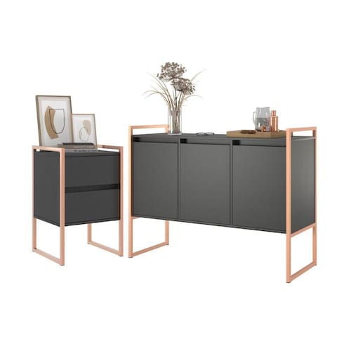 Com estrutura em aço 20x20, as peças apresentam durabilidade e estilo único. O buffet tem 3 portas e o gaveteiro possui duas gavetas espaçosas para organização. O acabamento em pintura epóxi proporciona um toque refinado e resistente.
