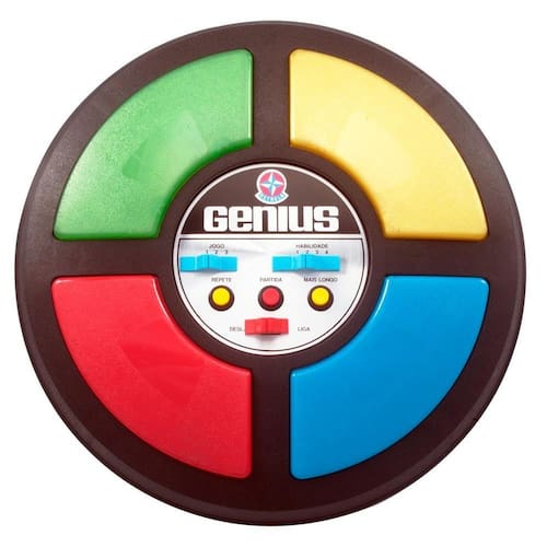 Jogo Genius da Estrela! Tiii, Titaa, Titatãã e Tooom. O clássico jogo dos anos 80 está de volta! Aceite o desafio: Pense rápido e tente repetir as sequências de luzes e sons. São três jogos diferentes e quatro níveis de dificuldade, com 5 maneiras diferentes de jogar. Emoção e ação para todas as idades! Especificações Marca: Estrela Idade recomendada: a partir de 6 anos Certificado INMETRO CE-BRI/IQB-AJ001 - NM 300/2002 - OCP 0006 Sobre a Estrela Desde 1937 a Estrela está presente na memória de quem é ou foi criança, formando gerações na convivência com bonecas, carrinhos, jogos, massinha, pelúcias e outros brinquedos. Em 1992, a Estrela fez a adequação do seu Sistema de Qualidade às Normas ISO 9001, recebendo o certificado de Sistema de Qualidade no. CE-SIQ-008/93, tornando-se a primeira empresa do ramo de brinquedos a receber este certificado.