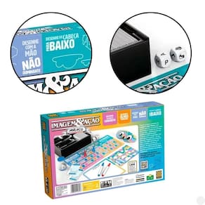 Prepare-se para a diversão No Imagem & Ação Maluco, cada jogador terá sua vez de brilhar como desenhista ou mestre das mímicas, só que antes... Deverá encarar um desafio sorteado no dadoÉ hora de soltar a imaginação, mas sem palavras ou gestos - só vale desenhar. Desafios como desenhar com a mão NÃO dominante, de olhos vendados, usando um gabarito, de cabeça para baixo, ou até mesmo tendo a sorte de seguir o jogando normalmente vão animar a competição