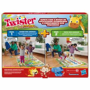 Jogo Infantil - 2 em 1 - Twister Junior - Hasbro Gaming: muita diversão com o jogo Twister Junior. Uma aventura com animais para crianças! Este jogo para crianças a partir dos 3 anos inclui tapete frente e verso e roleta reversível com 2 modos diferentes de jogo. O jogo Twister Junior oferece diversão para toda a família e é uma ótima maneira de manter as crianças entretidas em casa! Como jogar Twister Junior? • Nível 1 (Safári): O lado Safári dos Animais convida as crianças para uma aventura na trilha do safári. As crianças podem descobrir cores e brincar de fazer sons e movimentos de animais. Basta girar a roleta para se mover ao longo do percurso e alcançar a linha de chegada primeiro. • Nível 2 (Festa): Basta virar o tapete para brincar no modo Festa dos Animais. As crianças devem girar a roleta para descobrir qual cor e animal devem colocar o pé ou a mão. Os jogadores devem manter o equilíbrio enquanto combinam cores e animais. Cada jogador deve permanecer nos espaços e ser o último jogador a cair. Informações: • Produto: Jogo Twister Junior Infantil • Marca: Hasbro Gaming • Coleção: Twister • Tipo: Jogo Infantil • Categoria: Jogos e Tabuleiros • Subcategoria: Jogo Infantil • Objetivo: - Nível 1: ser o primeiro a alcançar a linha de chegada - Nível 2: ser o último jogador a cair • Participantes: de 02 a 04 jogadores • Conteúdo: - 01 tapete dupla face Twister - 01 roleta dupla face com seta - 01 manual regras • Recomendação: para crianças a partir de 03 anos de idade Especificações: • Referência: F7478 • Código de Barras: 5010996161888 • Embalagem (C x A x L): 33 x 27 x 04 cm • Embalagem (Peso): 0.590 kg • Composição / Material: Plástico • Registro: 008392/2023 • Certificado: Órgãos Autorizados - OCP´S (Organismos de Certificação de Produtos) Aviso: • As imagens são meramente ilustrativas • Os pesos, tamanhos e medidas são aproximados • As cores e estampas dos produtos podem ter variações • As informações são de responsabilidade do fabricante ou fornecedor