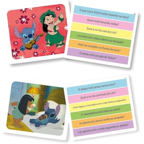 O jogo convida os pequenos a observarem cenas ilustradas com Stitch e Lilo, memorizarem detalhes e responderem a perguntas sorteadas pelo dado. Cada carta traz seis questões diferentes, o que garante muitas possibilidades de jogo e aprendizado contínuo.