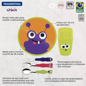 Para deixar a alimentação das crianças mais dinâmica e divertida, conte com o jogo infantil Tramontina Lirous colorido 05 peças. Seus talheres são desenvolvidos com lâminas em aço inox e cabos de polipropileno, ambas características que os deixam mais resistentes e duráveis. E ainda conta com um lindo prato e copo de pollipropileno. Todos eles contam com proteção antimicrobiana, inibem o crescimento de fungos e bactérias, deixando a refeição das crianças ainda mais segura! Orientações Lâminas de aço inox com bordas arredondadas que não machucam a boca da criança.Os cabos, copo e prato de polipropileno possuem maior resistência e durabilidade.Prato com borda mais alta para auxiliar a alimentação, evitando que a comida saia do prato. Produtos com proteção antimicrobiana que inibem o crescimento de fungos e bactérias, proporcionando benefícios em higiene e redução de microorganismos que causam contaminação.Podem ir a máquina de lavar louças, facitando a limpeza. Produtos Livre de BPA: O Bisfenol-A é um componente químico usado na produção de alguns plásticos como o Policarbonato. Este componente pode ser prejudicial à saúde e por isso a Tramontina não o utiliza em seus produtos. Características Gerais EAN13 7891112299498 DUN14 17891112299495 NCM 3924.10.00 Peso Líquido 0,2300 kg. Peso Bruto 0,3350 kg. Metragem 0,011718 m³. Dimensões Embalagem (Compr. X Larg. X Alt.) 300x 84x 465 mm. Observações Recomenda-se o uso destes produtos para crianças com 36 meses ou mais. Tenha cuidado ao manusear a faca e o garfo por serem produtos cortantes e perfurantes. Antes da primeira utilização, lave bem as peças e seque-as. Estes produtos podem ir à máquina de lavar, porém não recomendamos usar produtos abrasivos como saponáceos, esponjas rígidas ou palhas de aço. Seque-os bem antes de guardar. O prato e o copo podem ser utilizados no micro-ondas para aquecimentos breves de, no máximo, 3 minutos. Para descarte dos produtos e embalagem siga as orientações de reciclagem vigentes. Atenção: Por razões de segurança e saúde do seu filho, utilizar sempre os produtos com supervisão de um adulto. Não utilize os produtos caso apresentarem dano ou defeito. Verifique sempre a temperatura do alimento antes da alimentação.