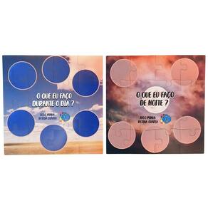 Como Jogar? O jogo é composto por dois quebra-cabeças , que, ao serem montados, mostram a placa da rotina diária de uma pessoa de manhã e à noite. Além disso, há diversas pecinhas com ilustrações de atividades que você deve associar corretamente às placas, decidindo se aquela ação ocorre de dia ou de noite.