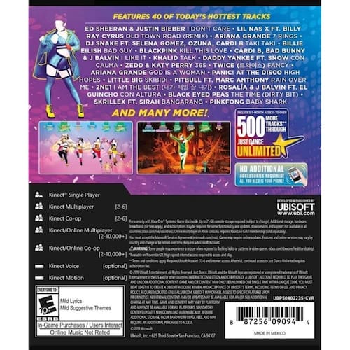 Just Dance 2020 - Xbox One Versão Europeia História do Produto:Just Dance 2020 é a mais recente edição da famosa franquia de jogos de dança da Ubisoft, trazendo uma enorme variedade de músicas de diferentes gêneros para você dançar e se divertir Com uma seleção de mais de 40 músicas, Just Dance 2020 oferece uma experiência de dança divertida e acessível para jogadores de todas as idades.O jogo inclui músicas de grandes artistas, além de novos modos de jogo e recursos inovadores. Você pode jogar sozinho ou com amigos em partidas locais ou até mesmo online, competindo para ver quem faz os melhores passos de dança. Just Dance 2020 também oferece o modo Just Dance Unlimited, que permite acessar um catálogo ainda maior de músicas. de 90 dias, exceto em casos de mal uso.Com Just Dance 2020, você terá a chance de dançar ao som de suas músicas favoritas, se exercitar e se divertir com seus amigos e família. Ideal para quem gosta de desafios de dança e para quem quer animar qualquer festa ou reuniãoSe você procura um jogo divertido e acessível para o seu Xbox One, Just Dance 2020 é uma escolha perfeita
