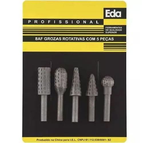 Jogo de lima grozas rotativas com 5 peças, ideais para escoriar, desbastar, para uso em madeira. Marca: EDA Características: -Jogo com 5 peças. Composição: -Material: Aço carbono. Conteúdo: -5 Grozas rotativas. Aplicação: Ideais para escoriar, desbastar, para uso em madeira. Código: 8AF