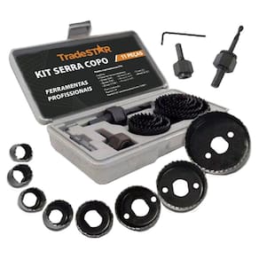 Jogo de serras copo para madeira - kit com 11 peçasContém 8 peças de 19 mm até 64 mm para madeira, madeira compensada, mdf.Características do produto:- material: aço carbono.- peso bruto: 890 gramas.- medidas serras copo: 19, 22, 29, 32, 38, 44, 51 e 64mm;Conteúdo do kit:- 8 serras copo- 2 hastes 1/4 e 3/8 ;- 1 chave allen;- 1 maleta.Detalhes importantesConfira algumas vantagens de comprar com a jjc ferramentas: Marca: Tradestar