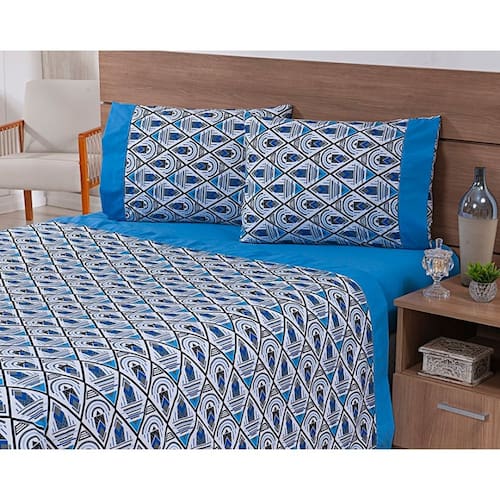 Jogo Lençol 4 Peças Cama Viúva 1,88mx1,28mx25cm 100% Algodão 180 Fios Losangos Azul