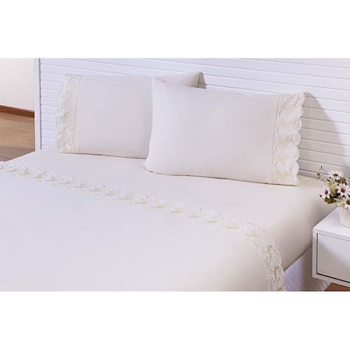Jogo lençol 4 peças viúva 120x203x30 200 fios bordado richileu palha jogo de lençol 4 peças cama 2,03 x 1,20 x 0,30 cama viúva 100% algodão 180 fios bordado richileu 01 lençol de cima 2,60m x 1,90m 01 lençol de baixo com elástico ao redor de todo o lençol para melhor fixação no colchão não fica saindo da cama Para colchão 2,03 x 1,20 x 0,30 02 fronhas 70cm x 50cm Composição: tecido 100% algodão 180 fios Marca: Mtr Enxovais Ltda