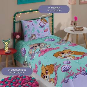 Com um toque leve e muita maciez, o jogo de cama da coleção Patrulha Canina vem para deixar as noites das crianças mais coloridas e cheias de alegria Ela ilustra toda a fofura das cachorrinhas Everest e Skye com lindas caudas de sereia, entre conchinhas e muita diversão no fundo do mar.