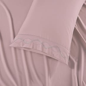 O Jogo de lençol para cama Casal Padrão com 04 peças confeccionado em tecido Percal 300 fios, vira do lençol de cima e fronha bordada. Possui alto padrão de qualidade, proporciona conforto e sofisticação.