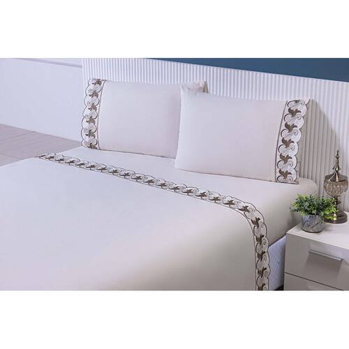 Jogo lençol casal queen 1,98mx1,58mx35cm 4 peças 180 fios 100% algodão barrado bordado tulipa cáqui Jogo de lençol casal queen size 4 peças 100% algodão 180 fios com barrado bordado richilieu