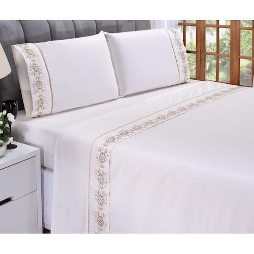 Jogo lençol Floral quarto casal Queen bordado 4 peças 2fronha - Cáqui