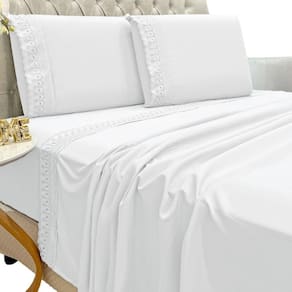 O Jogo de lençol para cama King com 04 peças confeccionado em tecido Percal 300 fios, detalhes em bordado na fronha e no lençol de cima. Possui alto padrão de qualidade, proporciona conforto e sofisticação.