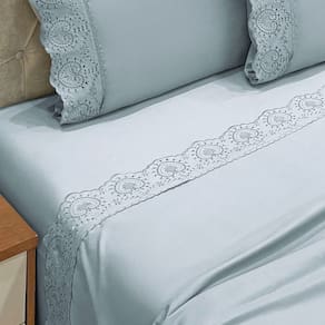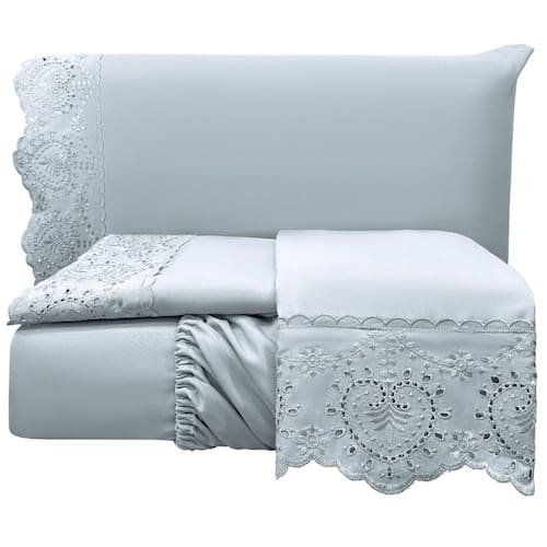 O Jogo de lençol para cama King com 04 peças confeccionado em tecido Percal 300 fios, detalhes em bordado inglês na fronha e no lençol de cima. Possui alto padrão de qualidade, proporciona conforto e sofisticação.