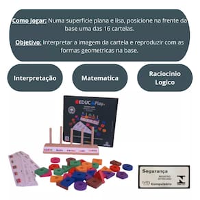 O Geomat Game é um jogo educativo que desafia as crianças a interpretarem imagens nas cartelas e reproduzirem-nas usando formas geométricas na base. Feito de madeira resistente, o jogo estimula habilidades matemáticas e de raciocínio, proporcionando uma experiência de aprendizado divertida e envolvente.