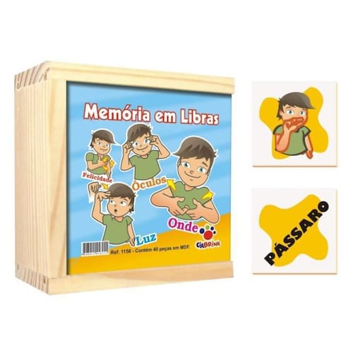 Características técnicas: - Título: Jogo Da Memória Em Libras - Material: Peças em MDF - Quantidade de peças: 40 - Indicação: A partir de 5 anos - Certificado pelo INMETRO: CE-BRI/ICEPEX-N 00934-29