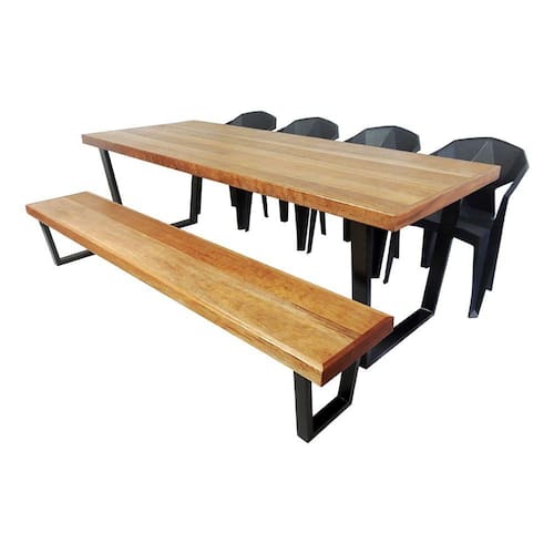 O JOGO MESA, BANCO E 4 CADEIRAS possui tampo e assentos em MADEIRA MACIÇA e BASE METÁLICA com pintura Epóxi Eletrostática que garante durabilidade e acabamento diferenciado ao produto, dando ar de modernidade e sofisticação à sua casa.