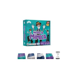 O jogo inclui 180 cartas temáticas de 56mm x 87mm com sugestões para mímicas criativas e uma ampulheta de 6,7 cm x 3,5 cm para cronometrar o tempo das rodadas.