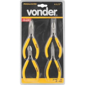 Jogo mini alicate c/ 4 pecas crv vonder Conteúdo da embalagem: 1 jogo de minialicates, composto por 4 peças, sendo: 1 alicate de corte diagonal 4.1/2, 1 alicate de bico meia-cana reto 4.1/2, 1 alicate de bico meia-cana curvo 4.1/2 e 1 alicate de bico chato 4.1/2
