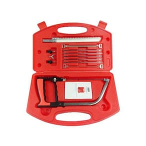 Composição do jogo: 1 Arco de serra 6 Lâminas para cortes em geral (Comprimento 150 mm) 1 Lâmina para desbatar ou afiar (Comprimento 150 mm) 1 Lâmina cilíndrica para cortar vidro e cerâmica (Comprimento 150 mm) 1 Serra para cortar madeira (comprimento 215 mm) 1 Parafuso de fixação para serra. 2 Riscadores de Tungstênio para vidro 1 Manual de instruções 1 Maleta plástica