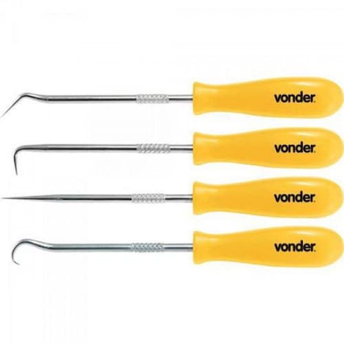 Jogo de Mini Pegadores com 4 Peças da VONDER Possui cabo plástico e haste em aço, ideal para separar fios, retirar pequenos fusíveis e anéis de borracha. Dimensões:2 x 12 x 23cm A x L x P Peso:100g