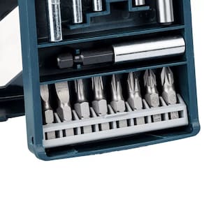- 8 pontas aparafusadoras de 25 mm: PH1, PH2, PZ1, PZ2, SL4, SL8, T20, T25