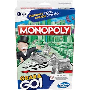 A clássica experiência do emocionante jogo de tabuleiro agora em formato compacto Fácil de transportar, cabe na mochila e pode ser jogado em qualquer lugar Um jogo para crianças e adultos que amam estratégia e diversão Com partidas dinâmicas para 2 a 4 jogadores, o Monopoly Grab and Go é um mini jogo perfeito para viagens de carro, avião ou trem Uma excelente opção de jogo para jogar com amigos e com a família nas férias e finais de semana