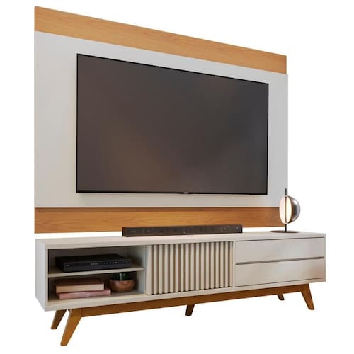 A Bancada é perfeita pois possui detalhes ripados garantindo a elegância do seu ambiente. Comporta TVs de até 75 Polegadas.