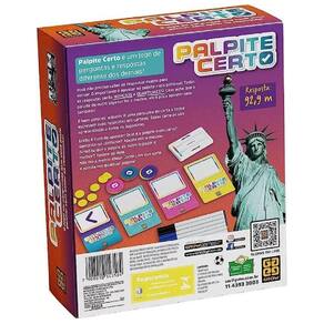 Jogo Palpite Certo - Grow Palpite Certo é um jogo de perguntas e respostas diferente dos demais! Você não precisa saber as respostas exatas para vencer. O importante é apostar no palpite mais próximo! Todas as respostas serão NÚMEROS e QUANTIDADES! Caso ache que o palpite de outro jogador foi o melhor, você pode apostar nele também! É bem simples: alguém lê uma pergunta da carta e todos escrevem suas respostas em cartelas. Essas cartelas são apresentadas a todos os jogadores. Então é hora de apostar! Qual é o palpite mais certo? Sentindo-se confiante? Aposte em si mesmo. Acredita que o palpite de outro jogador é melhor? Aposte no dele. Não faz a menor ideia? Conte com sua sorte e aposte em qualquer palpite! Selo Inmetro: CE-BRI/ICEPEX-N 01264-25 Ean: 7908010143584