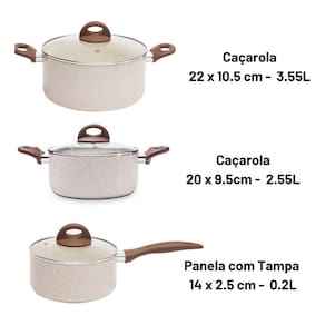 Com a nova geração de antiaderente cerâmico: a Pro Ceramic Premium, as panelas estão mais resistentes, livres de metais pesados e elementos químicos prejudiciais à saúde, exigem menos uso de óleo, não deixam os alimentos grudarem, facilitam na limpeza e consomem menos energia. Tudo para deixar a sua alimentação saudável e prática. Os cabos e alças são revestidos com Soft-Touch, não esquentam e proporcionam um toque macio e confortável durante o uso. Possuem tampas de vidro temperado com saída para o vapor.