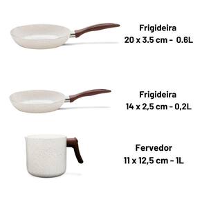 O conjunto é composto por seis peças: duas caçarolas com tampas (22x10,5 cm e 3,55 litros e 20x9,5 cm e 2,55 litros), duas frigideiras (20x3,5 cm e 0,6 litro e 14x2,5 cm e 0,2 litro), uma panela com tampa (16x8 cm e 1,25 litro) e um fervedor (11x12,5 cm e 1 litro). Nesta versão, a cor da pintura externa é vanilla.