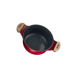 Especificações Técnicas 16 a 24cm: Revestimento Externo: Alumínio Fundido Vermelho. Revestimento Interno: Antiaderente em Cerâmica cor Cinza. Alça Madeira Tampa de Vidro.