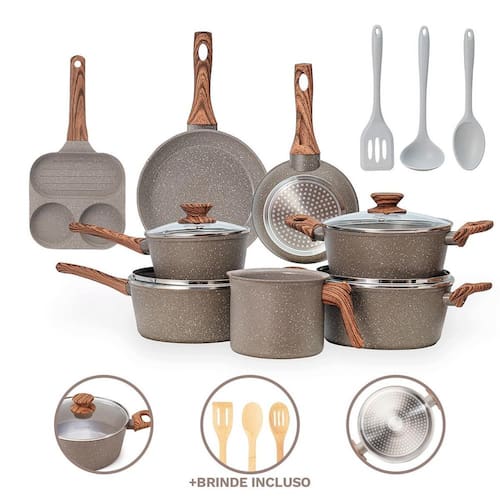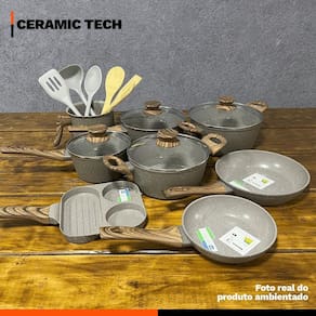 Distribuído por feheros shop Jogo de panelas 11 peças 4mm revestimento cerâmico premium indução Atenção As panelas com revestimento cerâmico possuem propriedades antiaderentes, mas não são 100% antiaderentes. Para melhores resultados, recomenda-se o uso de pequenas quantidades de óleo. O revestimento cerâmico é uma alternativa saudável e ecológica, pois não libera substâncias tóxicas quando aquecido. - panelas premium com certificação inmetro nível a - não deixe a chama do fogão pegar nas laterais das panelas - leia atentamente a descrição e siga as recomendações do fabricante Informações do produto Este conjunto completo oferece versatilidade e sofisticação para a sua cozinha. Compatível com todos tipos de fogão, inclusive por indução, suas peças são fabricadas com revestimento cerâmico de alta qualidade, que garante durabilidade, resistência e maior segurança alimentar. Livre de pfoa e ptfe, é uma opção saudável e sustentável. O design moderno com acabamento premium valoriza o ambiente e proporciona aquecimento rápido e uniforme, otimizando o tempo de preparo e reduzindo o consumo de energia. Especificações técnicas - compatível com fogões a gás, elétricos, vitrocerâmicos e de indução - revestimento cerâmico em 3 camadas com espessura de 4 mm - cabo de baquelite com revestimento soft touch, confortável e seguro - livre de pfoa e classificado como nível a no inmetro - fundo triplo com base de indução: estrutura que combina alumínio e revestimento cerâmico - revestimento: 2 camadas cerâmicas + 1 camada resistente a alta temperatura Ficha técnica do produto - panela 16 cm: d 16 cm x a 8,5 cm c 1300 ml p 730 g - panela 20 cm: d 20 cm x a 9 cm c 2250 ml p 1050 g - caçarola 20 cm: d 20 cm x a 9 cm c 2250 ml p 1080 g - caçarola 22 cm: d 22 cm x a 10 cm c 3250 ml p 1350 g - leiteira 14 cm: d 14 cm x a 10,5 cm c 2000 ml p 350 g - frigideira 18 cm: d 18 cm x a 4 cm c 750 ml p 300 g - frigideira 22 cm: d 22 cm x a 4,7 cm c 1450 ml p 500 g - frigideira grill 3 em 1: 18 x 18 cm x a 2 cm p 600 g - colher silicone 29 cm: 29 cm x l 6,5 cm p 120 g - concha silicone 29 cm: 29 cm x l 9 cm p 110 g - espátula vazada silicone 29,5 cm: 29,5 cm x l 7 cm p 110 g Importante: d = diâmetro, a = altura, c = capacidade, p = peso Antes do primeiro uso - lave com esponja macia e detergente - seque com pano macio - aplique um pouco de óleo na parte interna - leve ao fogo baixo por 2 minutos - desligue o fogo e espere esfriar - lave novamente e seque Após o uso - evite choques térmicos. Deixe esfriar antes de lavar - lave à mão com água morna, esponja macia e detergente - enxágue e seque com pano macio - para alimentos queimados, deixe de molho e lave - não utilize utensílios metálicos, objetos afiados ou produtos abrasivos Itens inclusos no pacote - 01 panela 16 cm com tampa de vidro - 01 panela 20 cm com tampa de vidro - 01 caçarola 20 cm com tampa de vidro - 01 caçarola 22 cm com tampa de vidro - 01 leiteira 14 cm - 01 frigideira 18 cm - 01 frigideira 22 cm - 01 frigideira grill 3 em 1 18cm - 01 colher silicone 29 cm premium - 01 concha silicone 29 cm premium - 01 espátula vazada silicone 29,5 cm premium acompanha - 01 espátula vazada de bambu - 01 colher vazada de bambu - 01 colher para arroz de bambu Todas as fotos são reais dos produtos. Qualquer dúvida, estamos à disposição Dúvidas frequentes 01 - o produto pode ir ao forno R: não, este conjunto não é adequado para uso no forno devido ao cabo em baquelite 02 - o produto é novo Possui 03 - é compatível com fogão de indução R: sim, o conjunto possui fundo especial que permite o uso em fogões de indução, além de fogões a gás, elétricos e vitrocerâmicos