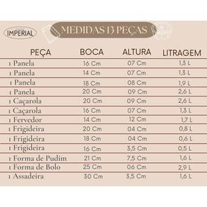 01 - panela de 14cm de diâmetro 01 - panela de 16cm de diâmetro 01 - panela de 18cm de diâmetro 01 - panela de 20cm de diâmetro 01 - caçarola de 16 cm de diâmetro 01 - caçarola de 20 cm de diâmetro 01 - fervedor de 14 cm de diâmetro 01 - frigideira de 16 cm de diâmetro 01 - frigideira de 18 cm de diâmetro 01 - frigideira de 20 cm de diâmetro 01 - forma de bolo 25 cm de diâmetro 01 - forma de bolo 30 cm de diâmetro 01 - assadeira retangular 30 cm de diâmetro 01 - panela de pressão 2 litros