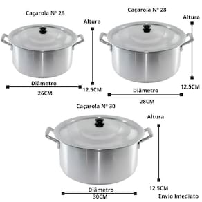 - Material: Alumínio de alta qualidade, resistente à corrosão e com excelente condução de calor - Tamanhos: Caçarolas nos tamanhos Nº 26, 28 e 30 para atender diferentes necessidades de cozimento - Espessura: Boa espessura para evitar deformações, proporcionando durabilidade e eficiência no cozimento - Alças Reforçadas: Alças firmes e ergonômicas, facilitando o manuseio seguro mesmo com o utensílio quente - Versatilidade: Ideal para preparar variados tipos de pratos, desde refogados e ensopados até carnes e legumes - Fácil Limpeza: Superfície de alumínio que facilita a limpeza e economiza tempo na cozinha